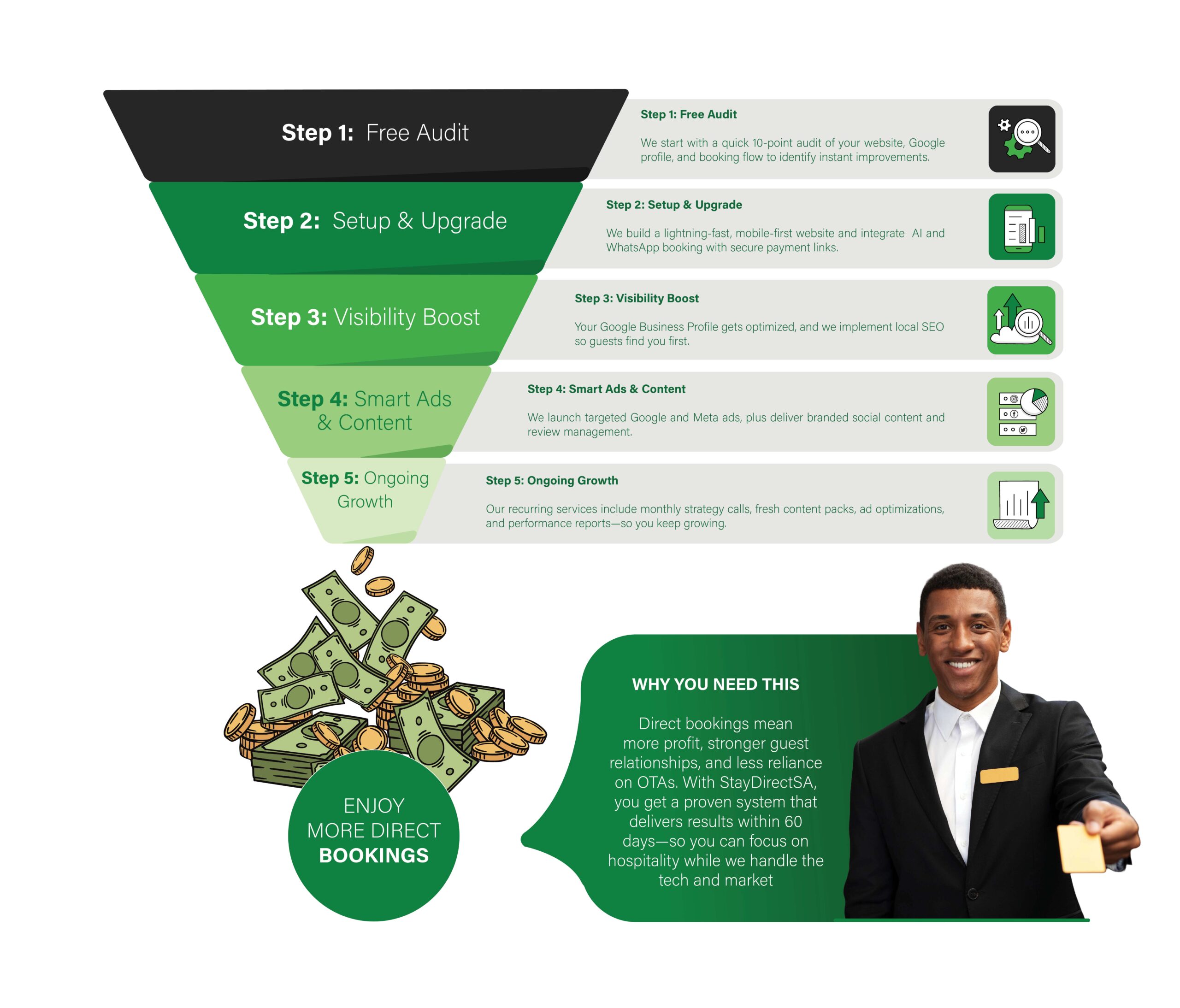 At StayDirectSA, we make growing your direct bookings simple and stress-free. Our product is designed for lodges, guesthouses, villas, and camping sites that want to stop losing margins to OTAs and start winning more guests directly.